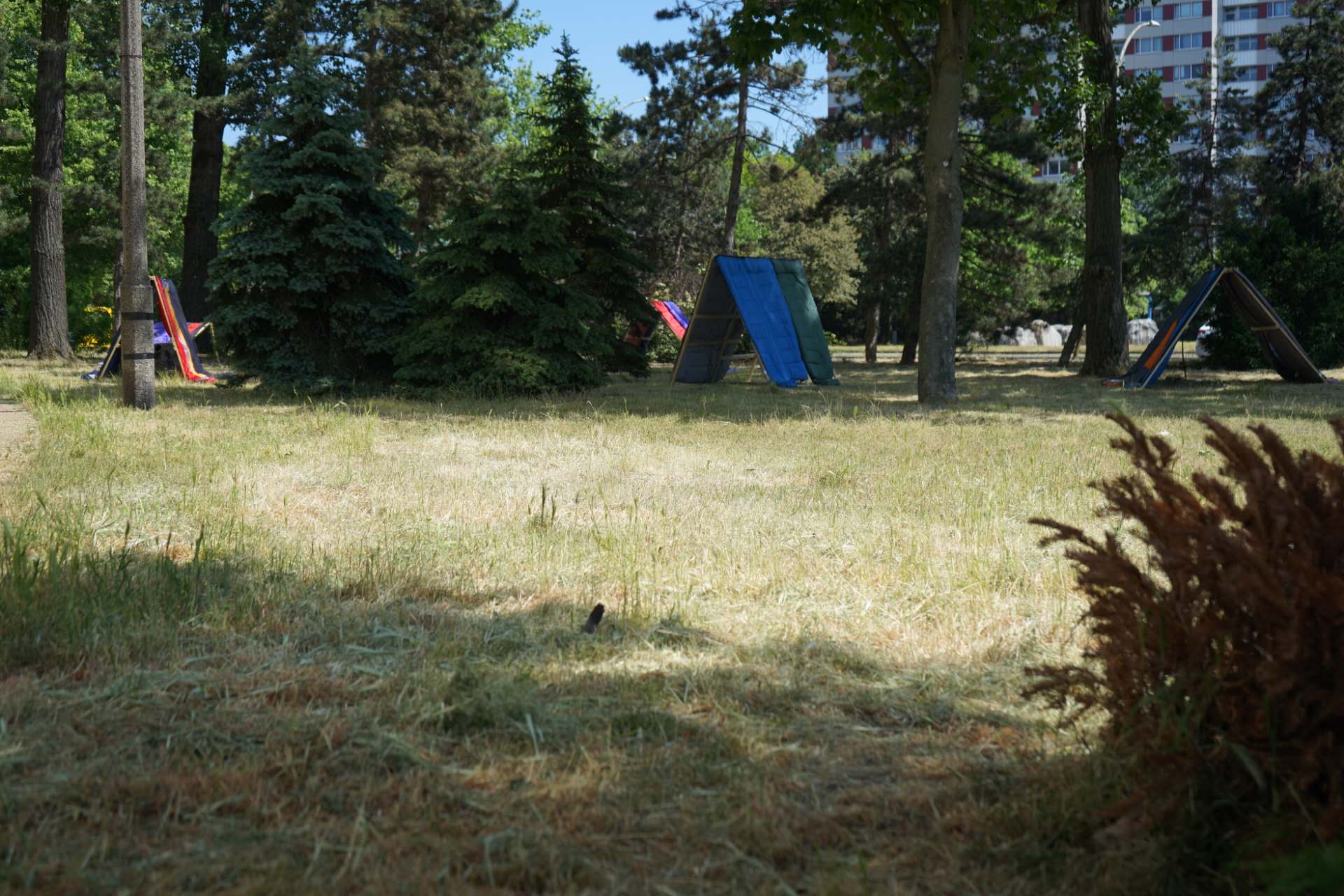 The number "7" in the title carries multiple layers of meaning. It references the creation week in Genesis, symbolizing rest, protection, and renewal in religious and cultural contexts. Simultaneously, it serves as an aesthetic and conceptual anchor that emphasizes the modular structure of the installation. The structures are designed as open frameworks without walls or doors, metaphorically visualizing the fragility and mobility associated with homelessness. This openness not only symbolizes a lack of security but also underscores the inherent ambivalence of the concept of "home."