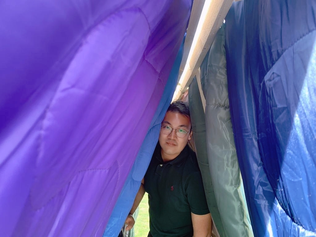 The installation comprises seven modular wooden roof structures, inspired by the "round ridge roof" of traditional Chinese architecture, historically associated with lower social classes. The deliberate choice of this modest roof form symbolizes social hierarchies and highlights the precarious existence of marginalized groups. Sleeping bags, serving as symbols of both protection and mobility, are draped over the wooden structures as "roof tiles." This symbolic use reflects the central role of sleeping bags in the lives of homeless individuals, offering protection, warmth, and a rudimentary sense of "home."
