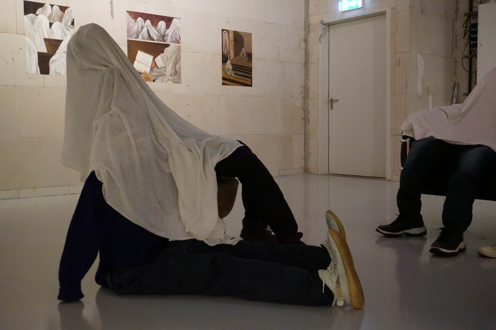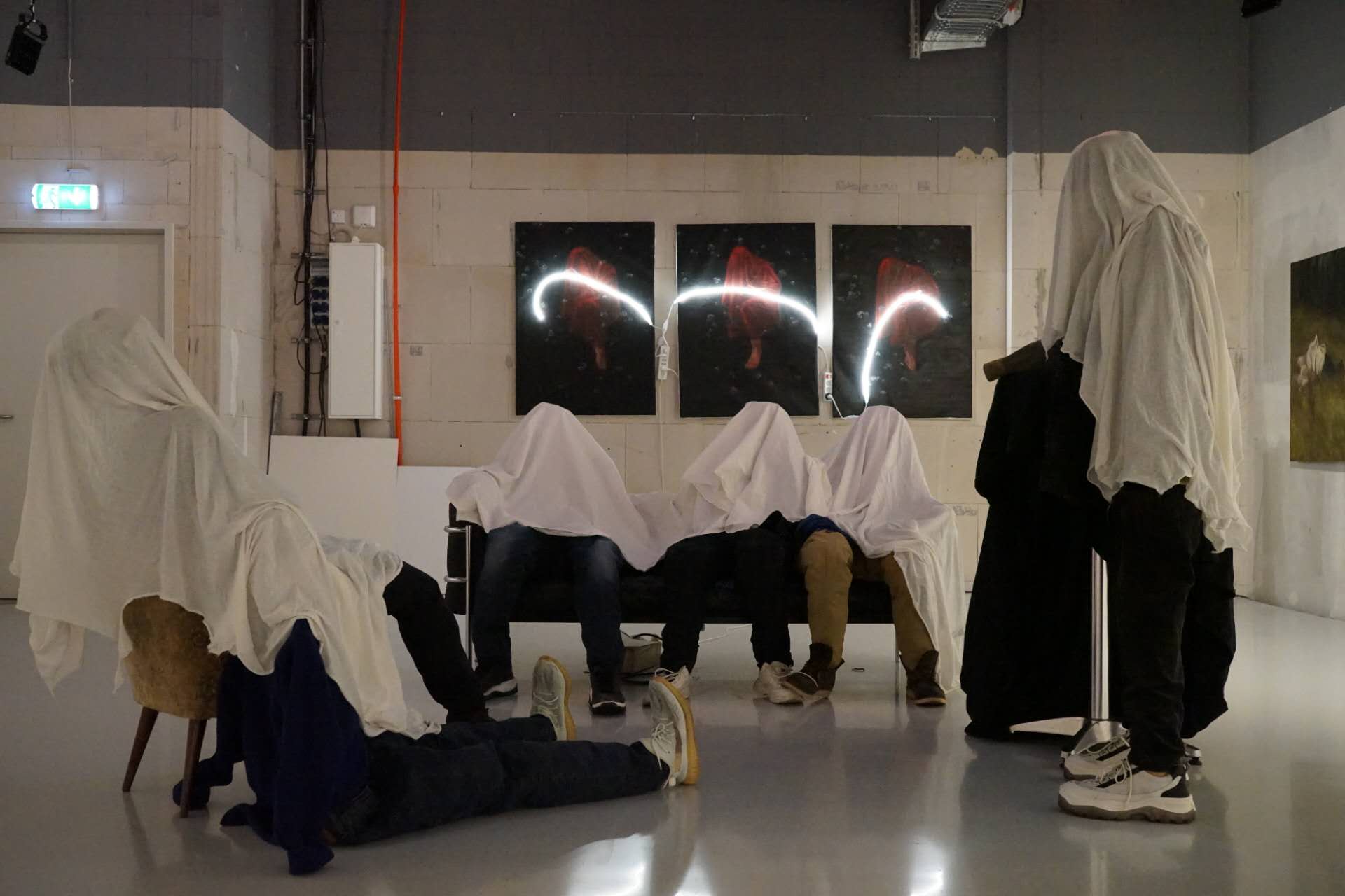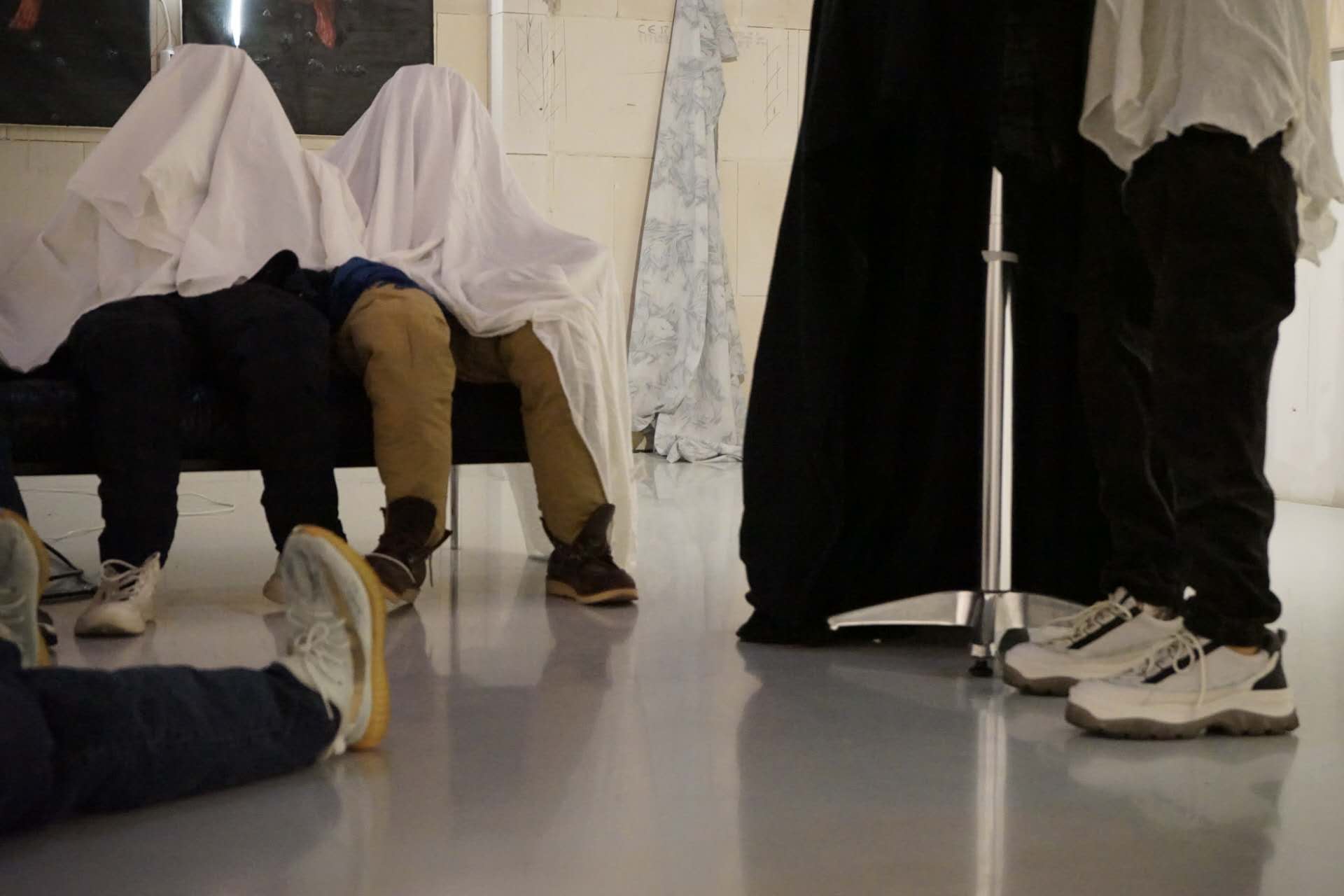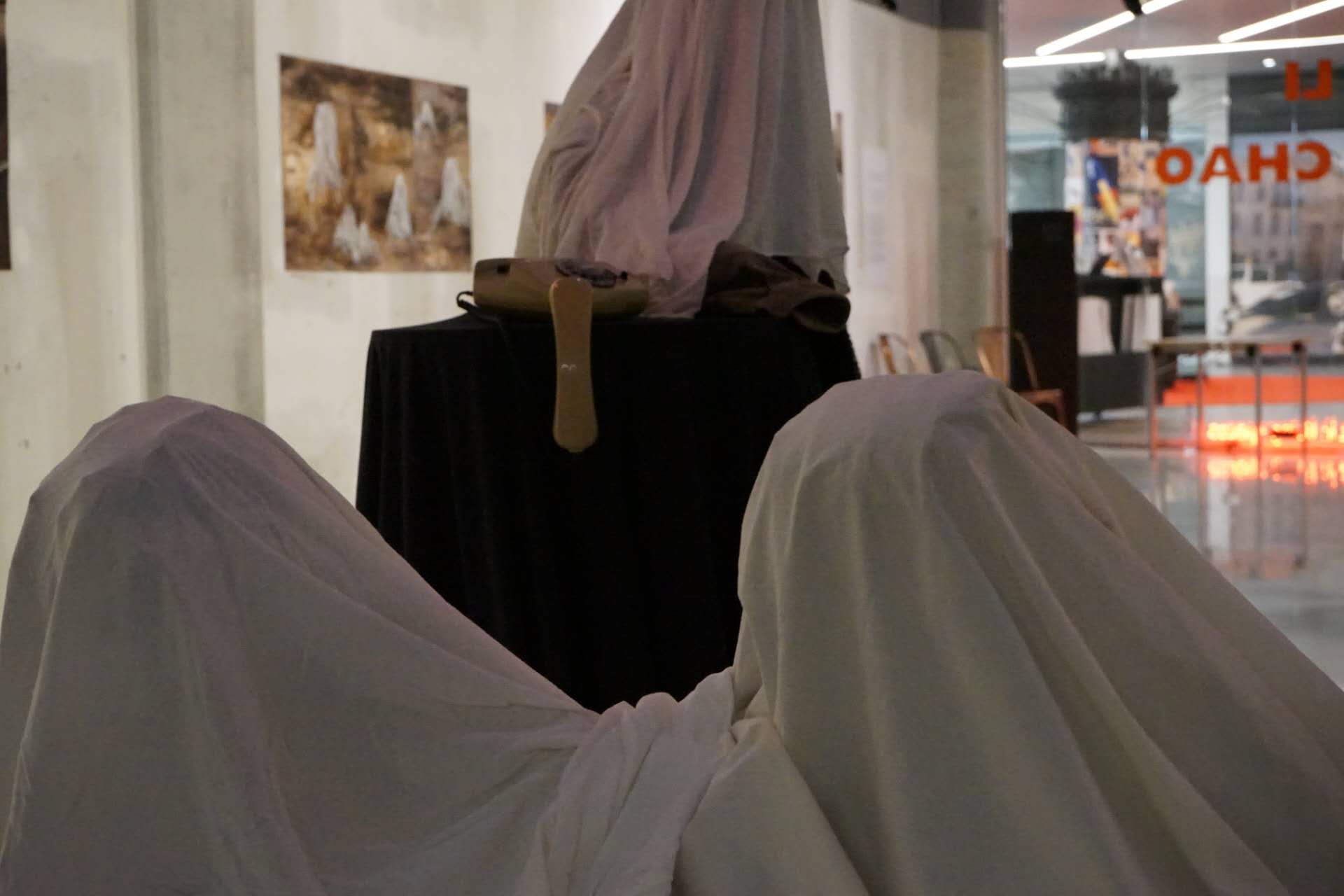 In this installation, six figures are seated around a sofa, seemingly engaged in a conversation. However, their upper bodies and heads are entirely covered with white cloth, concealing their faces and expressions. This concealment symbolizes the disappearance of authentic selfhood in interactions where boundaries are disregarded. Unable to discern their emotions, the viewer is left with only fragmented clues, reflecting the blurred line between sincerity and pretense in interpersonal relationships.