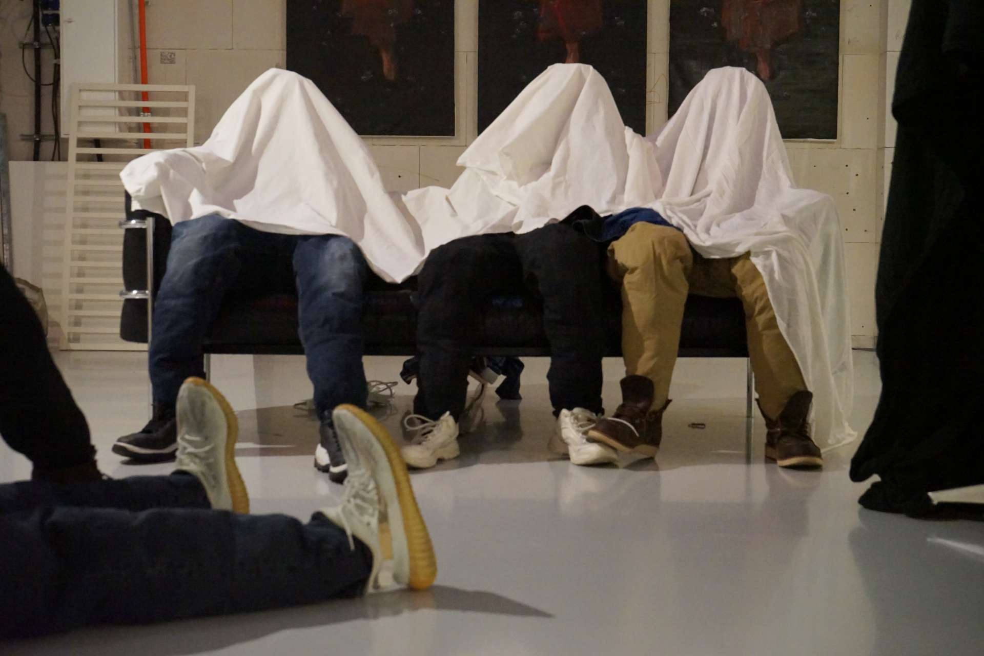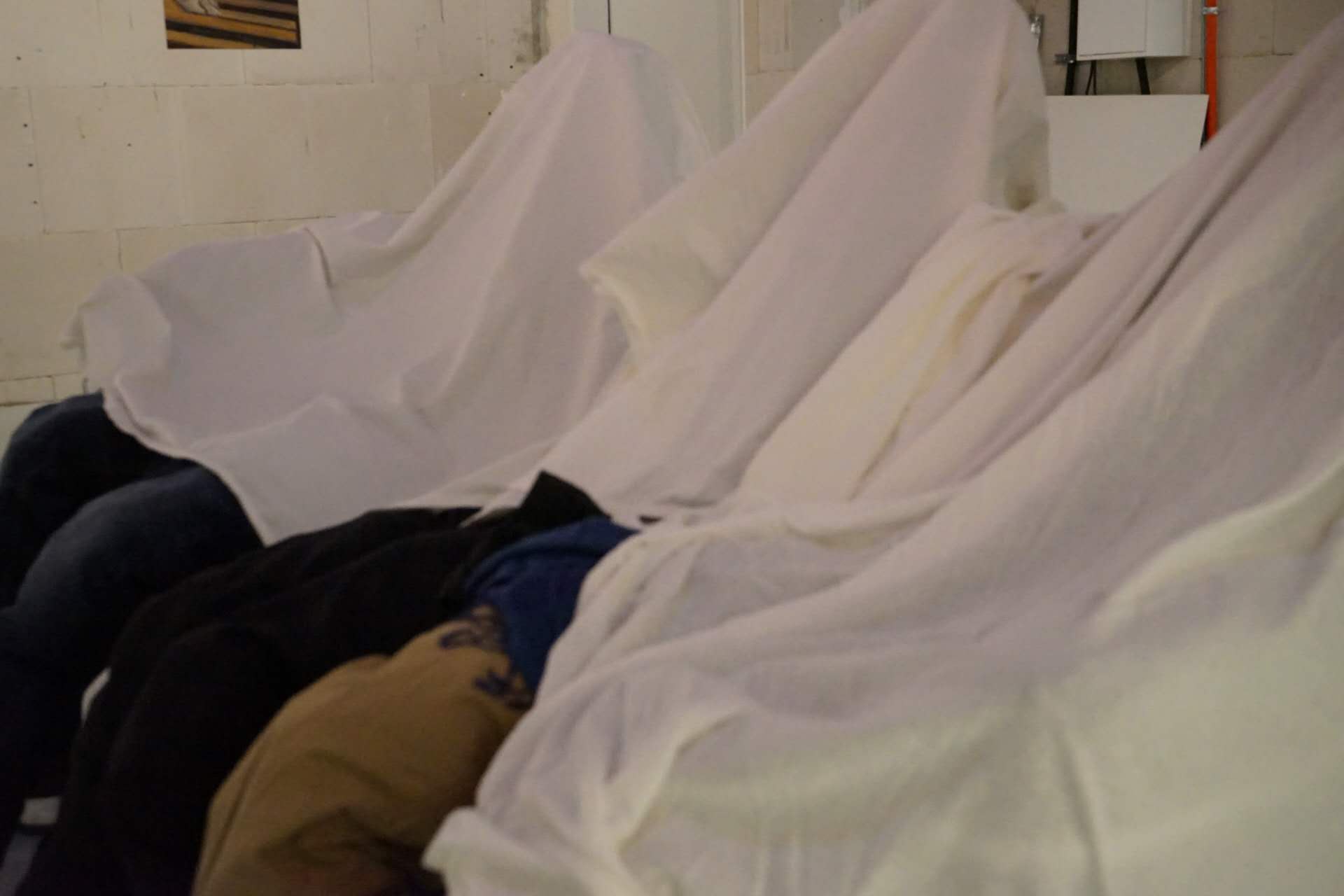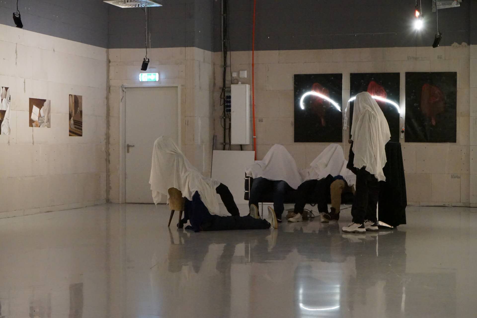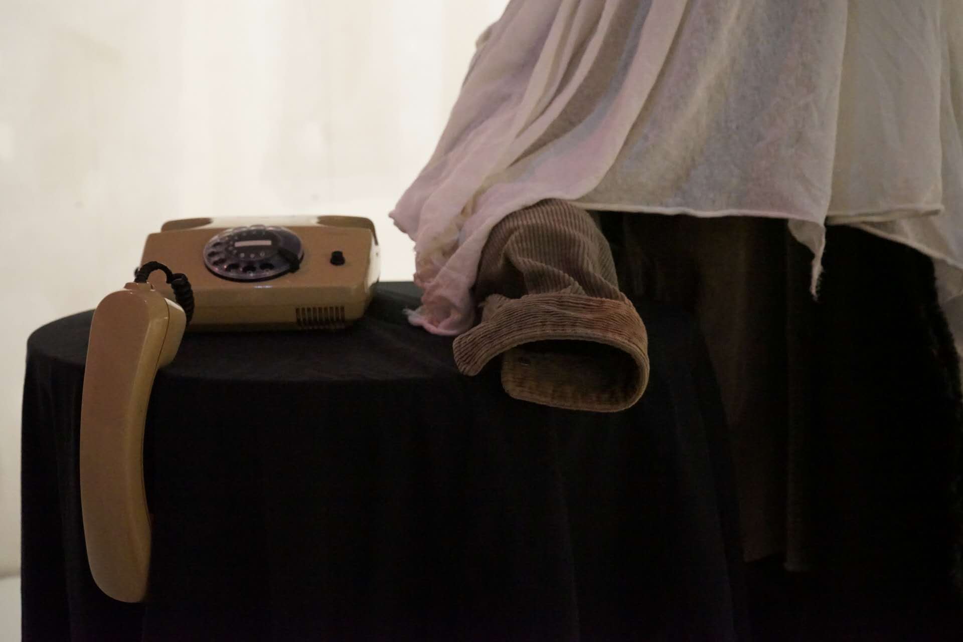 In this installation, six figures are seated around a sofa, seemingly engaged in a conversation. However, their upper bodies and heads are entirely covered with white cloth, concealing their faces and expressions. This concealment symbolizes the disappearance of authentic selfhood in interactions where boundaries are disregarded. Unable to discern their emotions, the viewer is left with only fragmented clues, reflecting the blurred line between sincerity and pretense in interpersonal relationships.