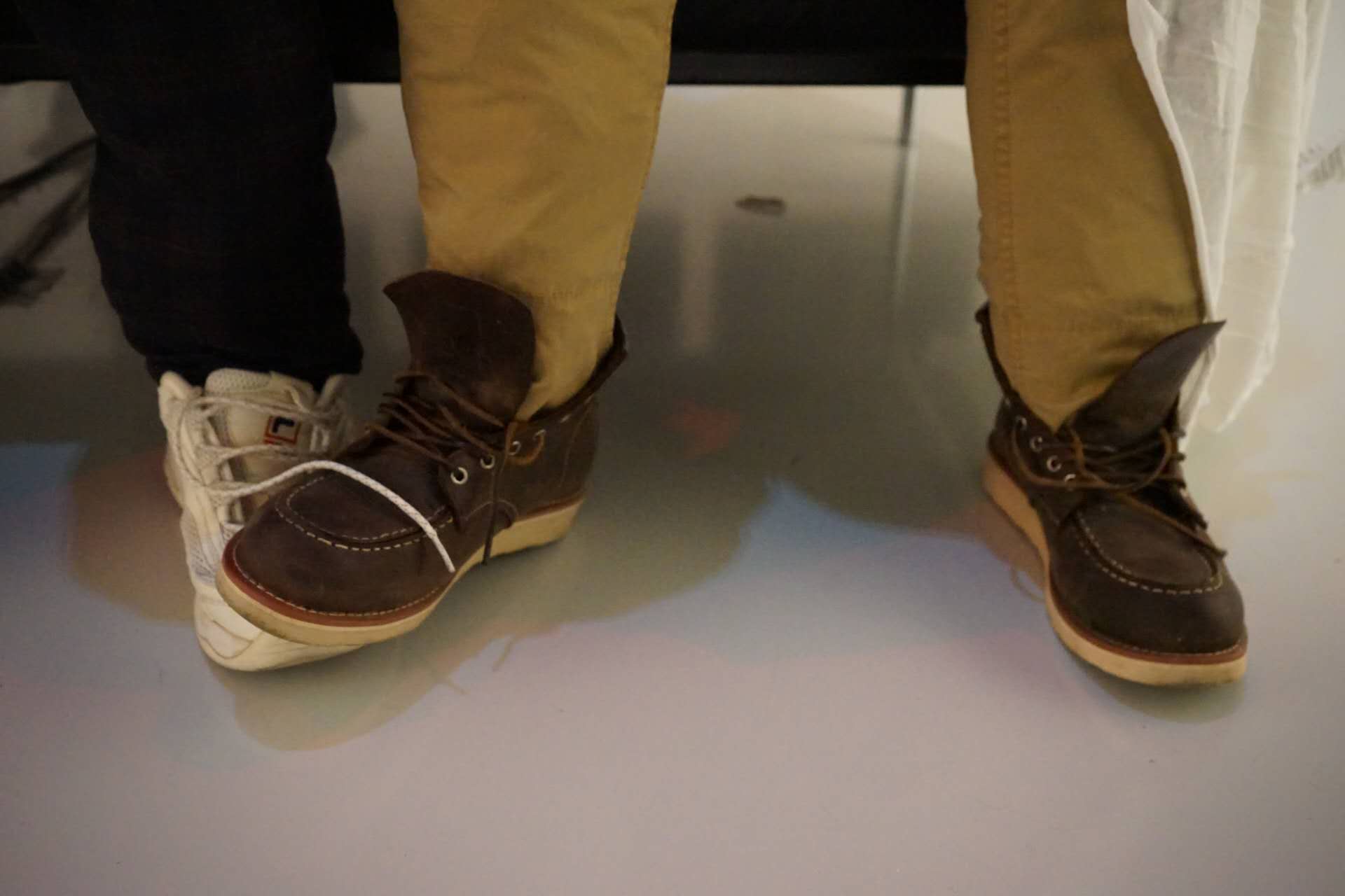 The characters' identities and statuses are subtly implied through their pants and shoes, while their postures and interactions reveal the tension and imbalance that arise when boundaries are crossed: